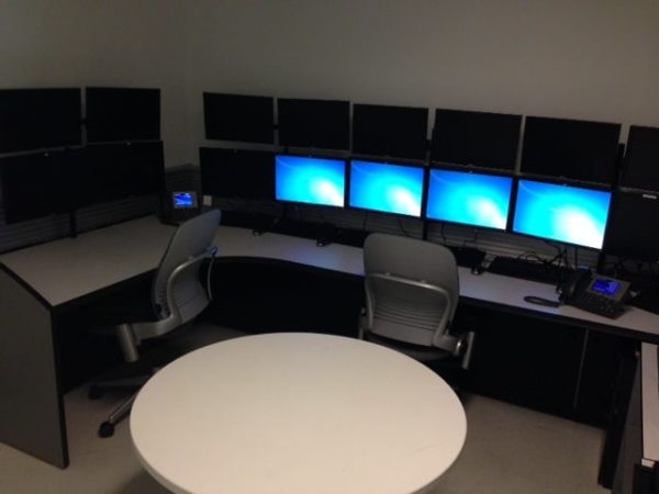 Control Consoles manufactured by Eurocraft. These feature slatwall for monitor mounting, enclosed base construction, internal wire management and a high pressure laminate finish.