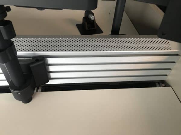 Trading desks manufactured by Eurocraft.  These Eurocraft trading desks feature slatwall for monitor mounting, enclosed base construction, internal wire management and a high pressure laminate finish.