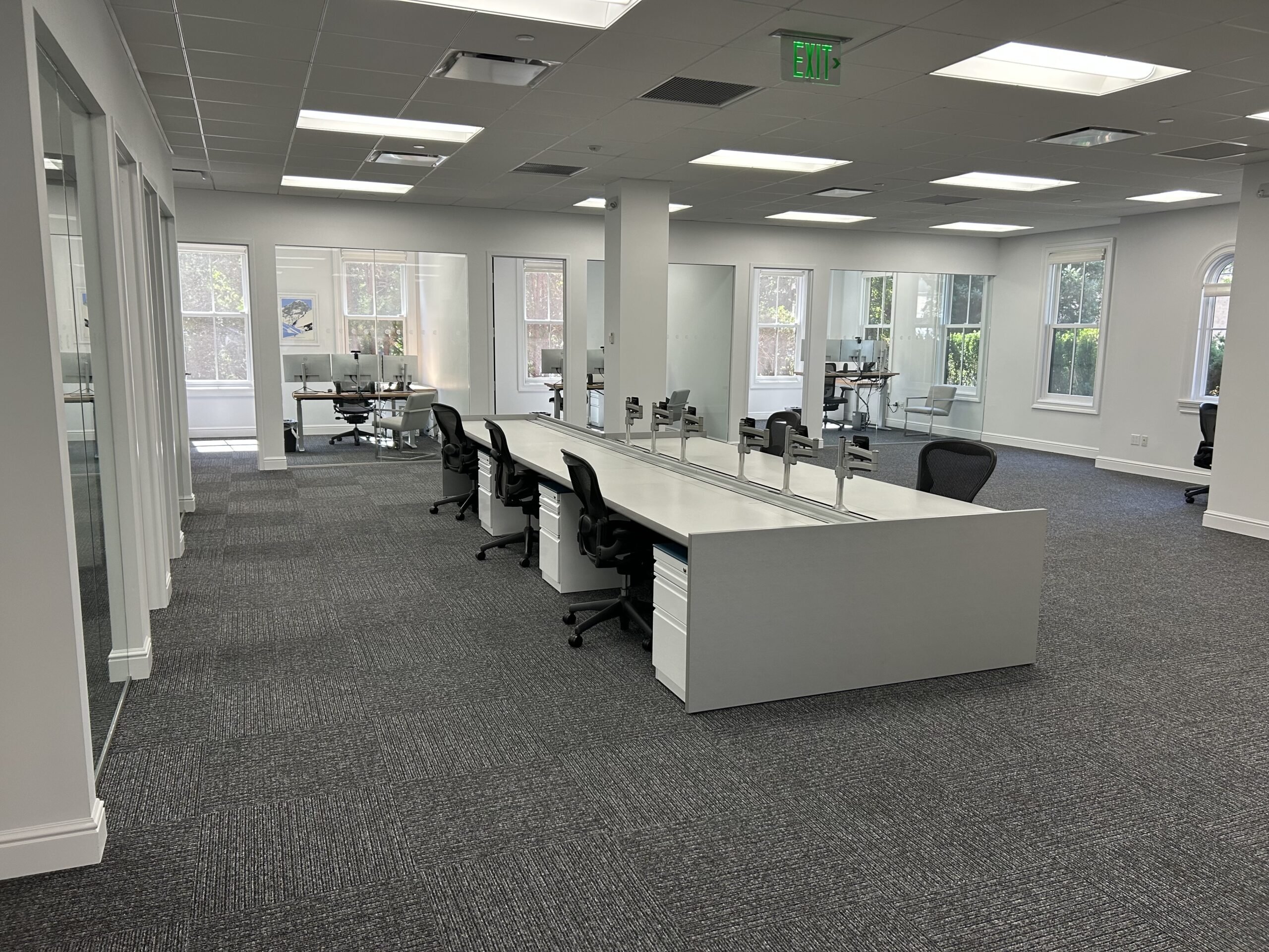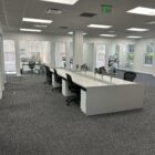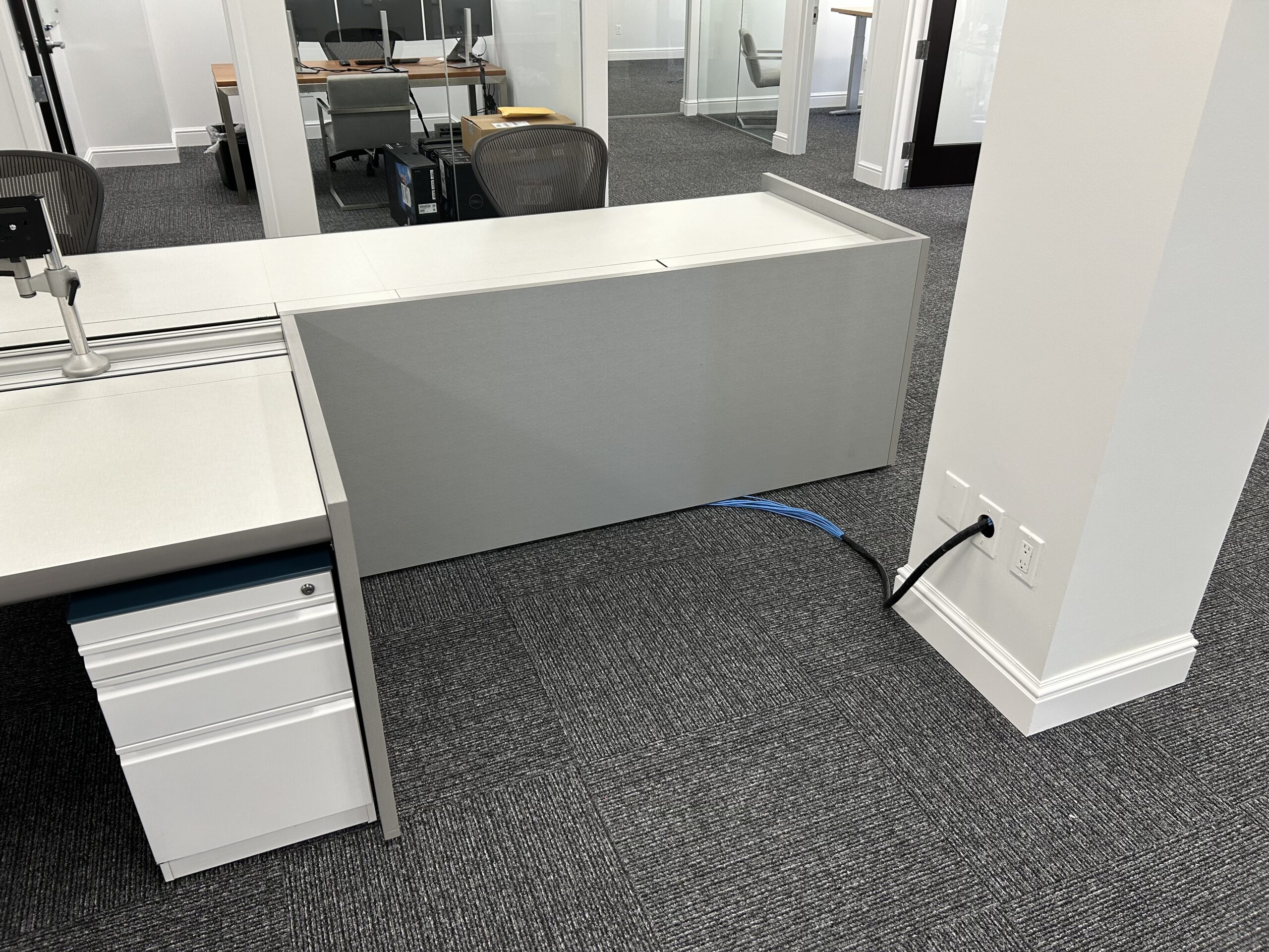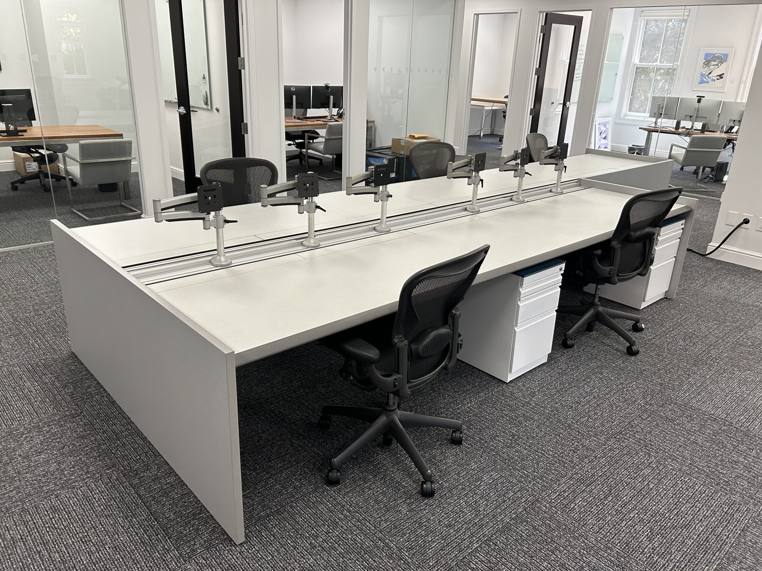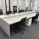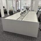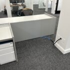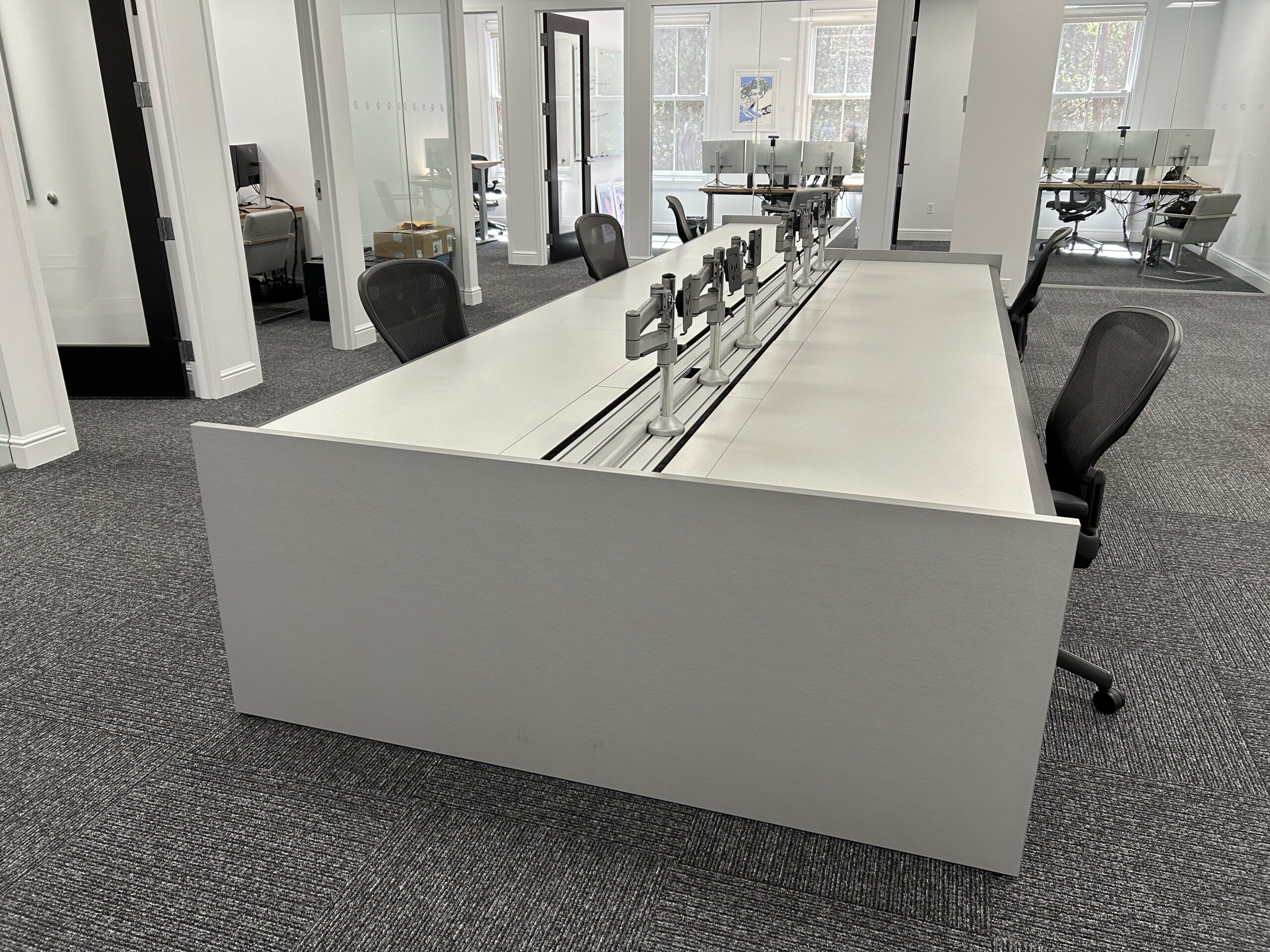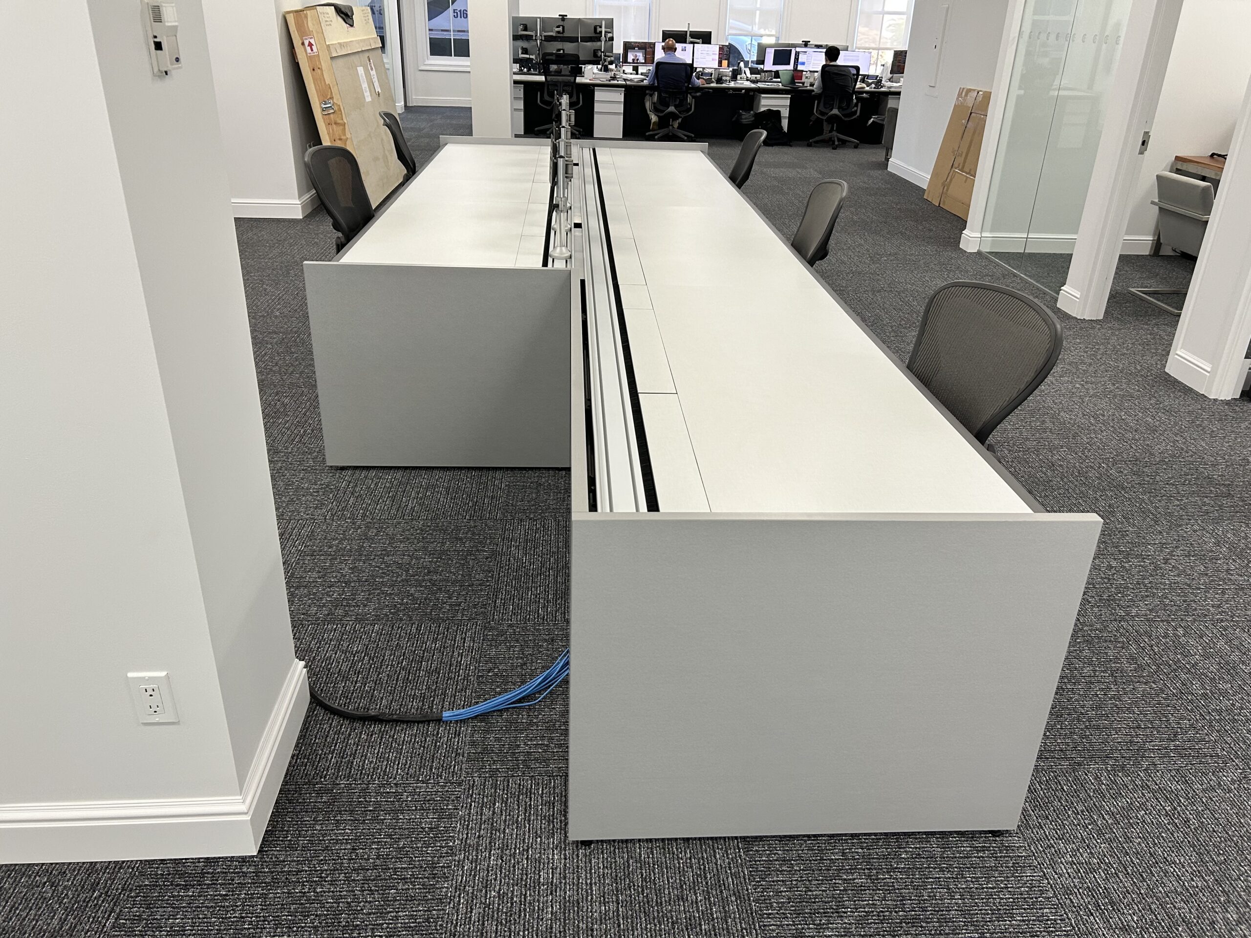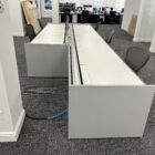 These single sided trading desks offer a rear monitor rail for mounting of monitors, a removable return surface area and acoustical fabric panels for both the front and side areas. All exteriors are finished in cherry veneer panels. The base frame structure of the unit provides ample cable management allowing for an organized operation.