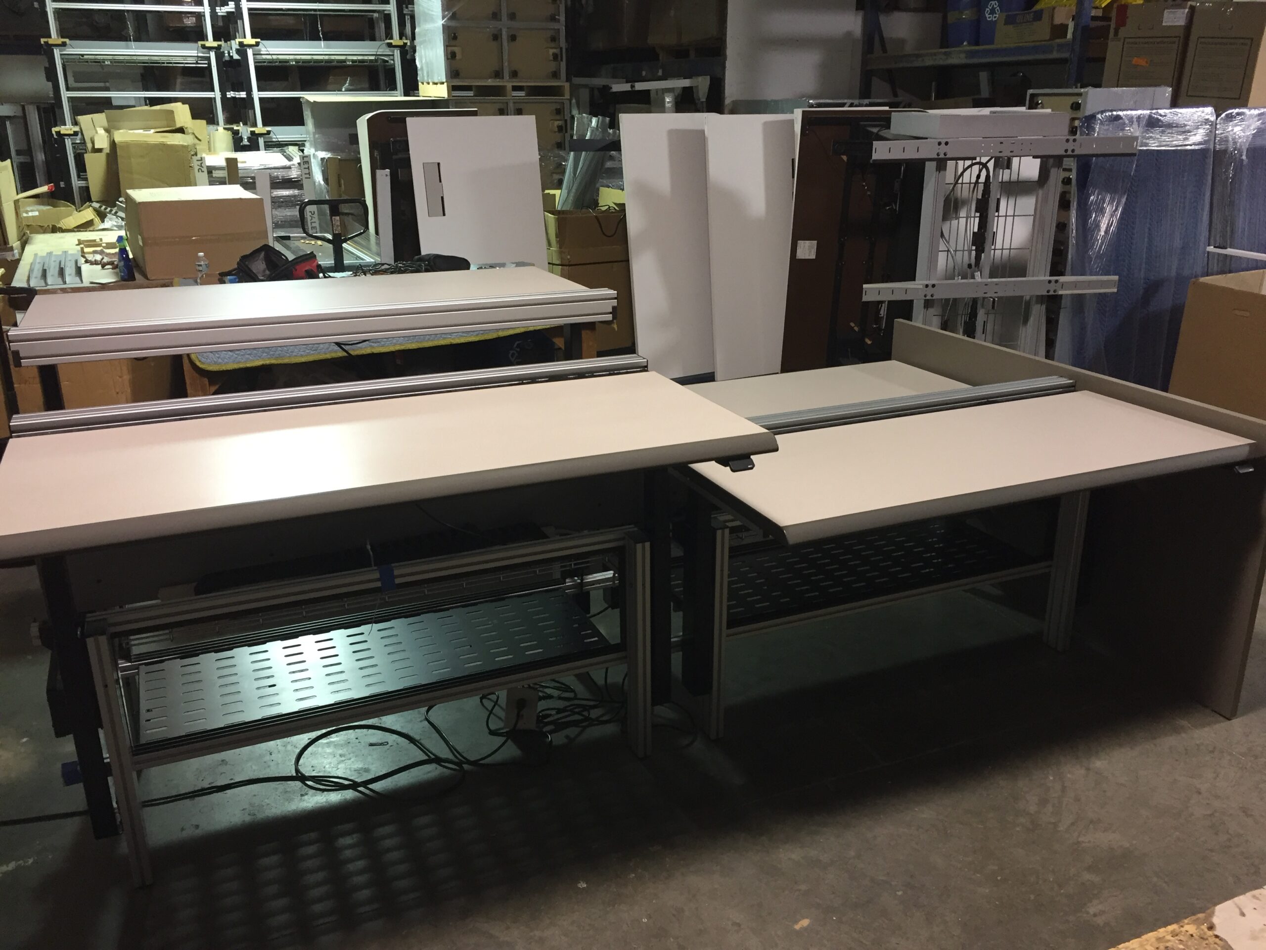 These are top of the line sit/stand consoles manufactured by LaCour.  Each station comes equipped with a technology rail that allows for the mounting of monitor arms to clear up the needed desk top space.  With a superior cable management system built in and desk top access to the cable raceways, keeping your technology under control will not be an issue!  The desk tops are equipped with a desk top mounted convenience outlet for the operators use.  The elevated base structures provides storage for the CPU and other devices with still allowing a streamlined look and feel.